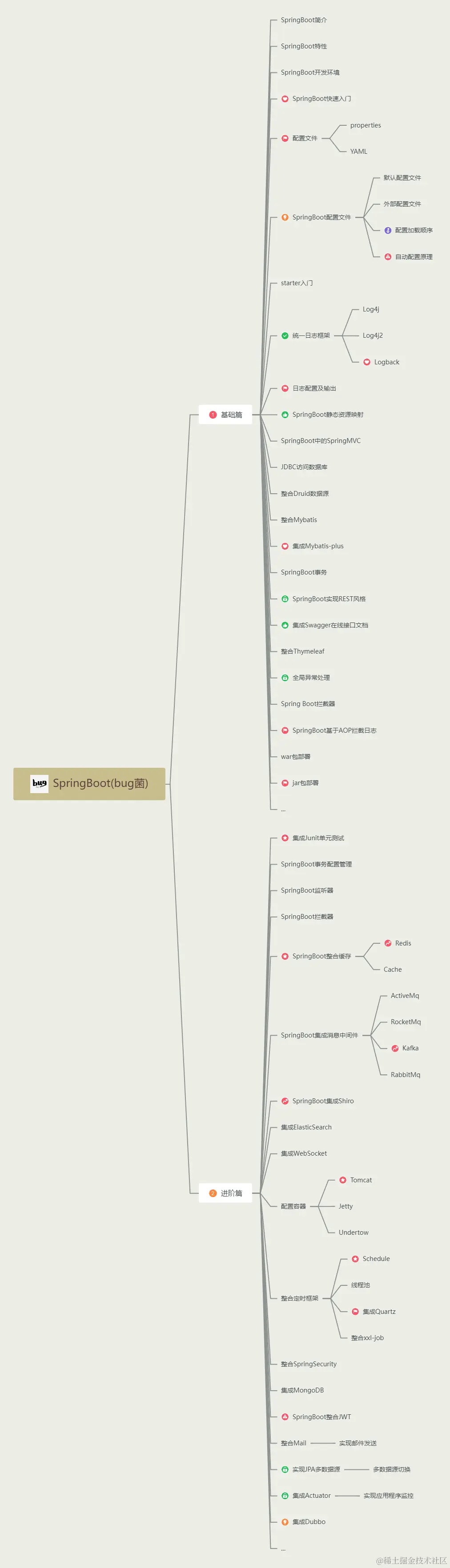 如下我整理了Spring Boot从入门到精通的完整学习路线,其中对所有技术点都做了难易程度标识,以便于大家能精准投入对应的学习时长。