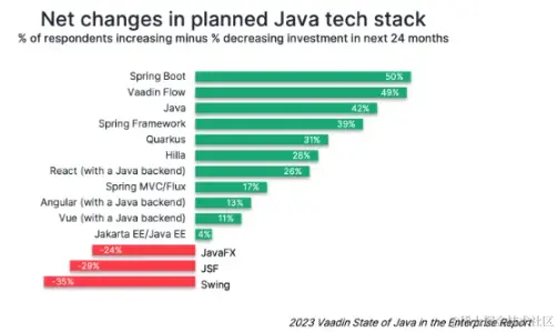 并且从 Vaadin 最近发布的一份有关企业中 Java 现状的研究报告也表明了,Spring Boot 已经超越 Spring 成为最受欢迎的 Java 后端框架: