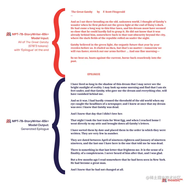 - 该模型的微调数据集为books3中经过筛选的小说子集,上下文长度为65k。虽然宣传的大小是65k词元,但当在单个节点的 A100-80GB GPU上运行时,团队已能得到了84k词元的回复。这背后的关键技术就是ALiBi。《了不起的盖茨比》原本只有约68k个词元,因此团队利用MPT-7B-StoryWriter-65k+模型为该小说创作了新的结尾。