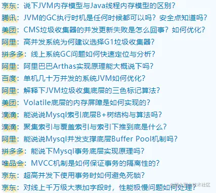 说到这,最近很多粉丝都跟我反馈说面试前都是觉得自己平时技术还行,背了八股文,完全够用了,没想到面试官不按套路出牌,直接上Java性能优化,并发底层相关面试题,如下所示(粉丝投稿收录总结):