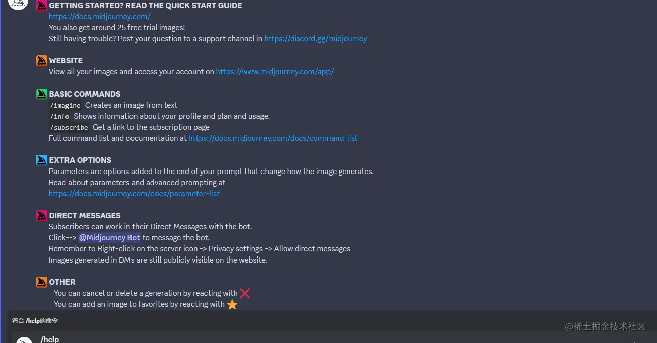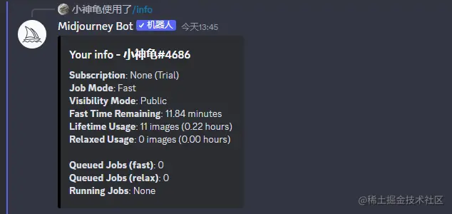 显示有关 Midjourney Bot 的有用基本信息和提示。