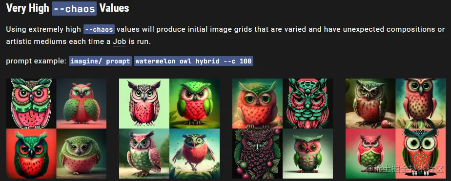--chaos <number 0–100>改变结果的多样性,默认值为0,数值越高,生成的四张图片的风格差别越大,更具有创造性