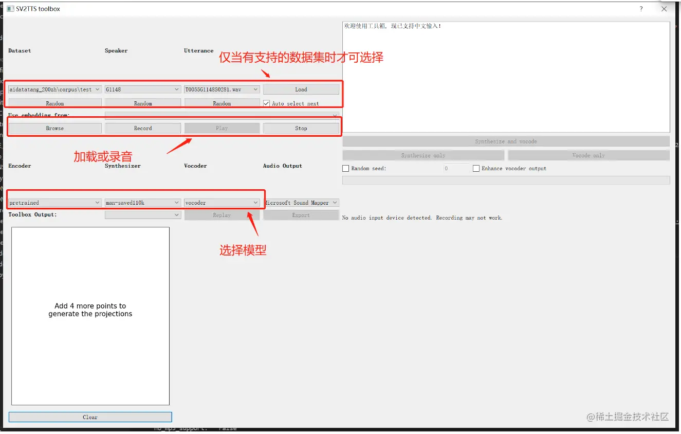 请指定一个可用的数据集文件路径,如果有支持的数据集则会自动加载供调试,也同时会作为手动录制音频的存储目录。