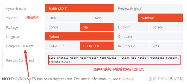 - PyTorch 选择对应的平台和版本后复制命令运行安装