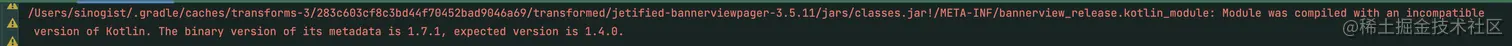 /Users/sinogist/.gradle/caches/transforms-3/283c603cf8c3bd44f70452bad9046a69/transformed/jetified-bannerviewpager-3.5.11/jars/classes.jar!/META-INF/bannerview_release.kotlin_module: Module was compiled with an incompatible version of Kotlin. The binary version of its metadata is 1.7.1, expected version is 1.4.0.