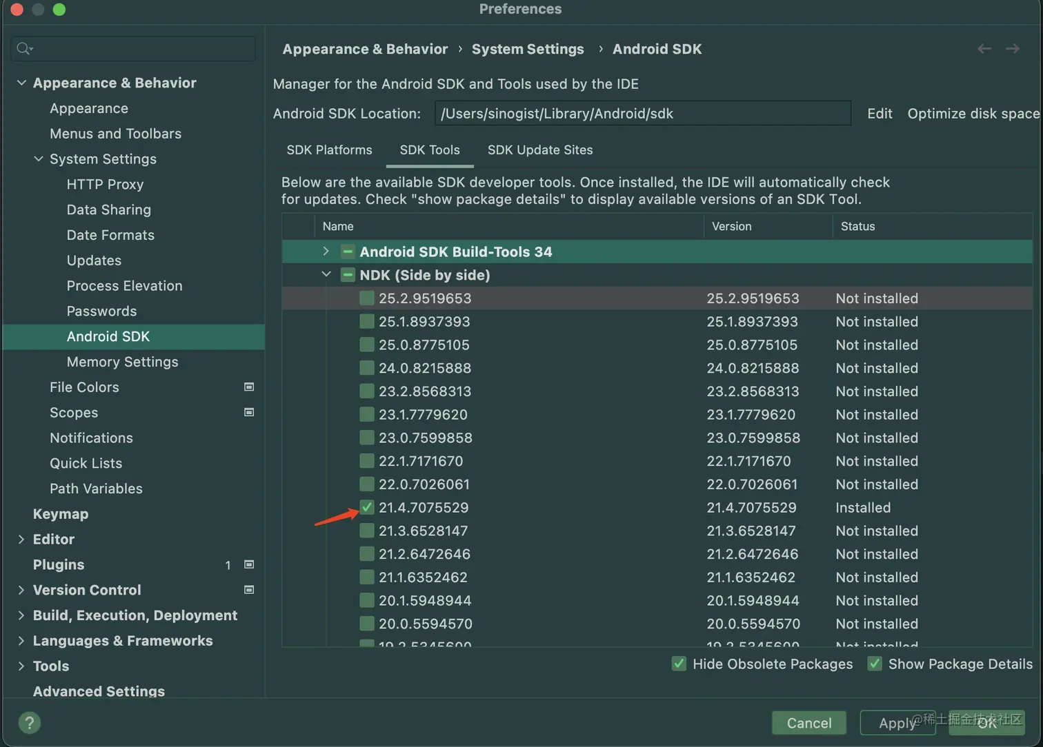 最后没办法了,只能回滚到最初的版本。插件版本为org.jetbrains.kotlin:kotlin-gradle-plugin:1.3.61,implemention都为Android的基础库。首先升级org.jetbrains.kotlin:kotlin-gradle-plugin:1.8.0,报错NDK at /Users/sinogist/Library/Android/sdk/ndk/21.4.7075529 did not have a s,解决办法如图