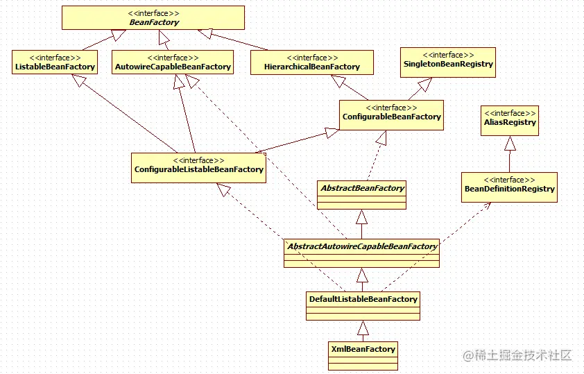 (这4级接口是BeanFactory的基本接口体系。继续,下面是继承关系的2个抽象类和2个实现类:)