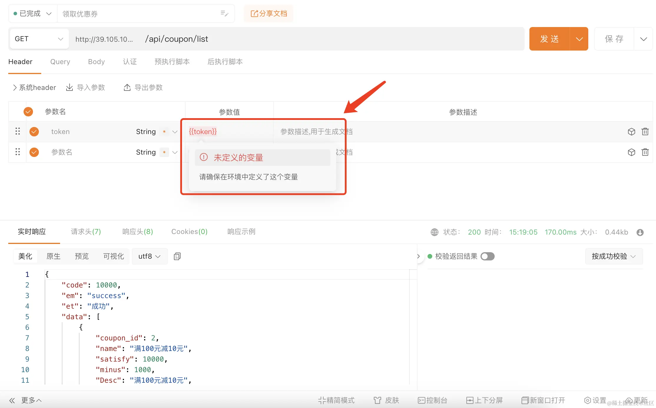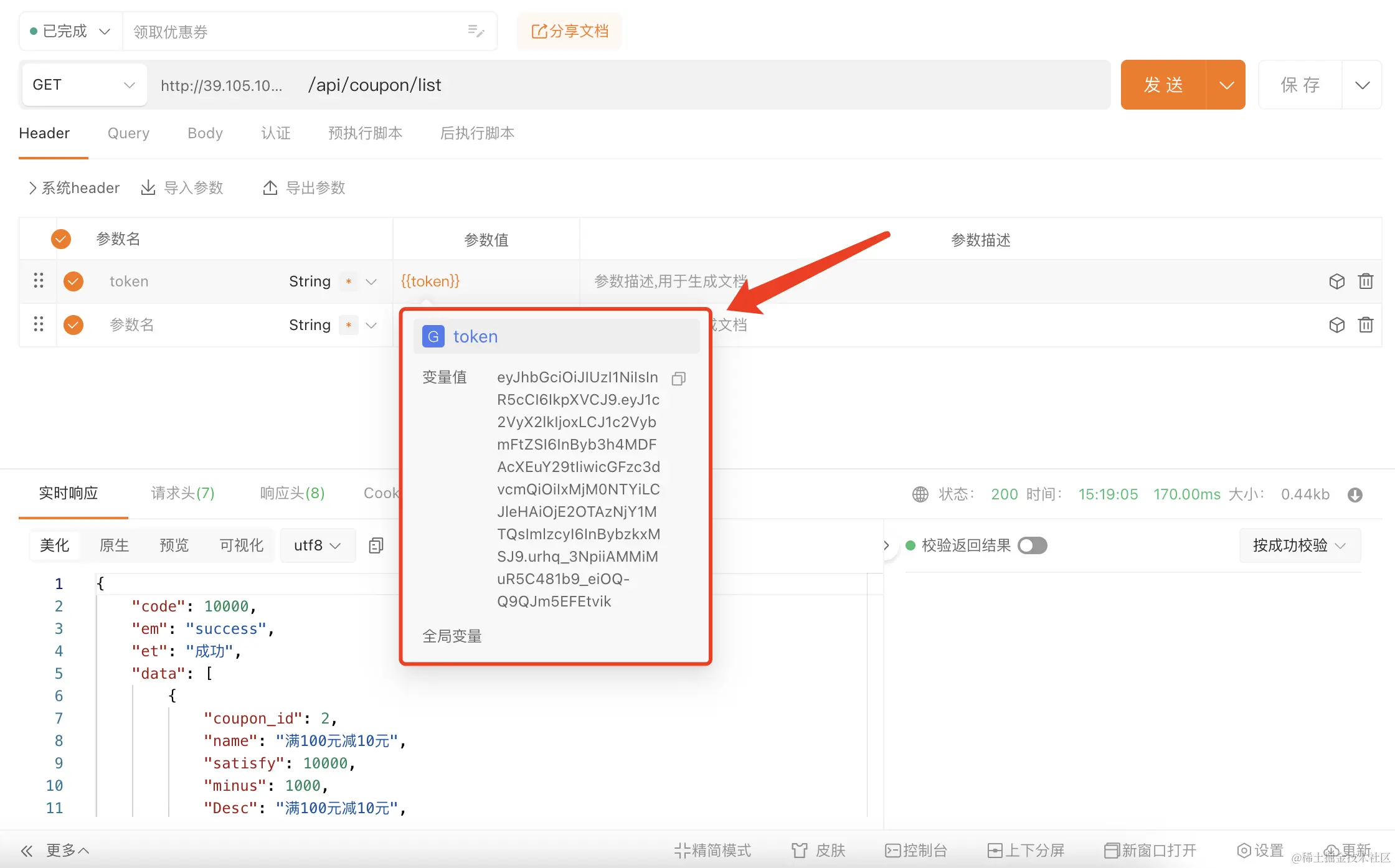 配置全局变量后在请求地址或参数值设置引用后的展示效果: