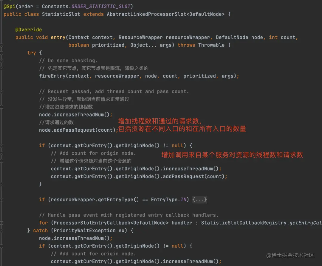 而StatisticSlot就是对这些统计Node进行实际的统计,比如加一下资源的访问线程数,资源的请求数量等等。