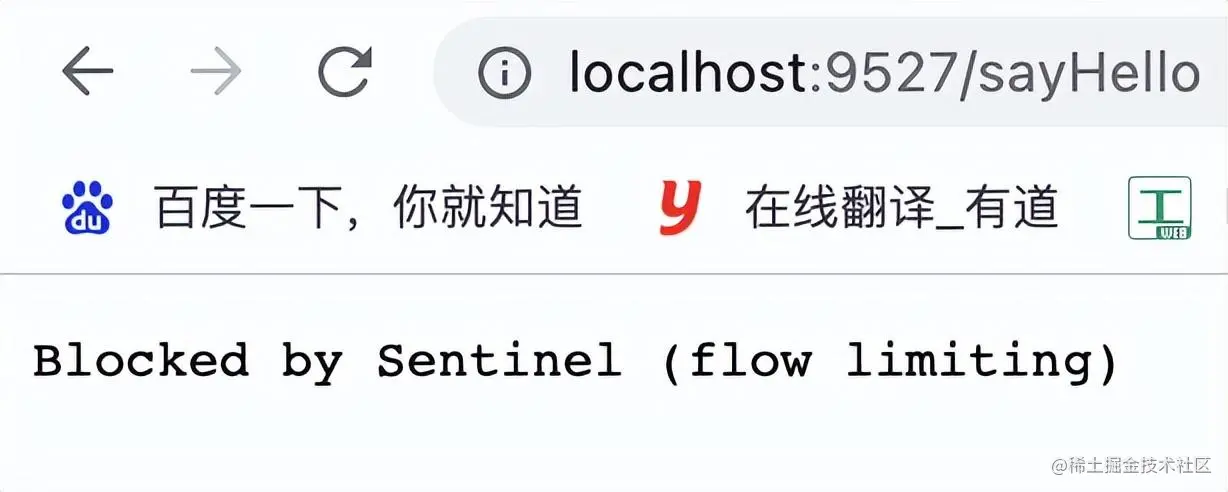 可以看出规则生效了,接口被Sentinel限流了,至于为什么出现这个提示,是因为Sentinel有默认的处理BlockException的机制,就在前面提到的进入资源的后面。