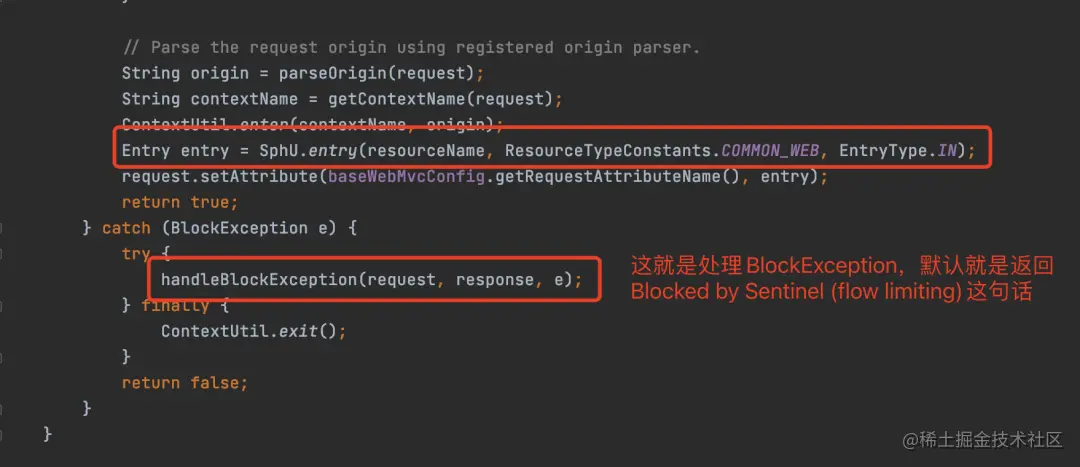 而真正的原因是Sentinel实现了SpringMVC中的HandlerInterceptor接口,在调用Controller接口之前,会将一个调用接口设置为一个资源,代码如下