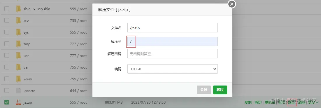 上传成功后解压。