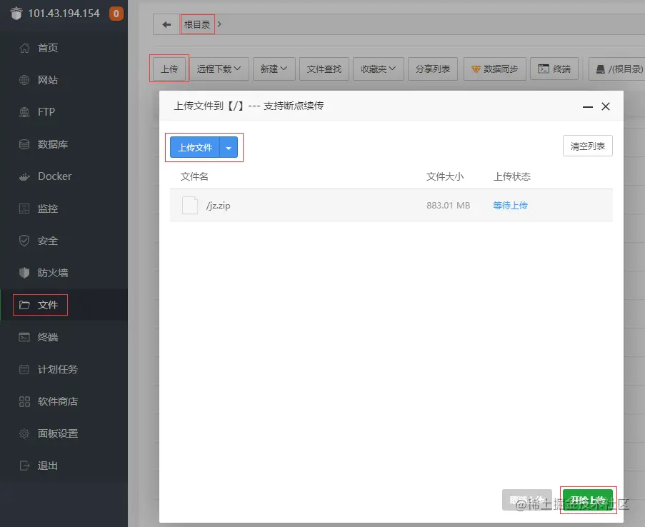 拿到源码后,将服务端目录下的 jz.zip 压缩文件通过宝塔上传到根目录(如果宝塔禁止上传到根目录,可上传其他路径后剪切粘贴到根目录)。
