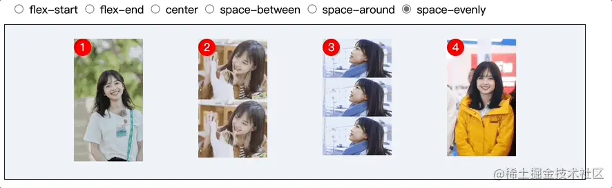 space-around:环绕,每个子元素两侧都环绕互不干扰的等宽的空白间距 -