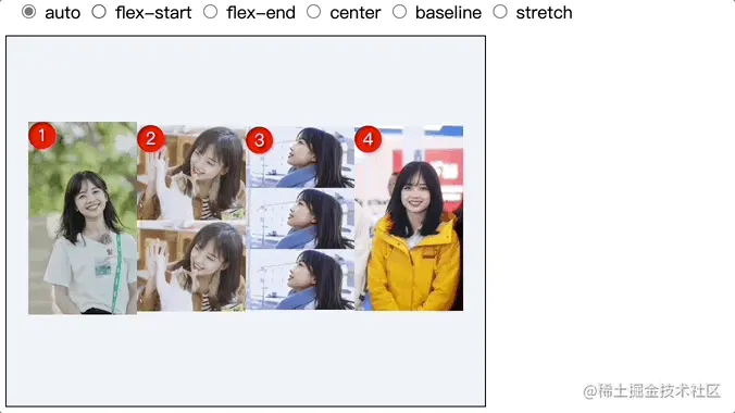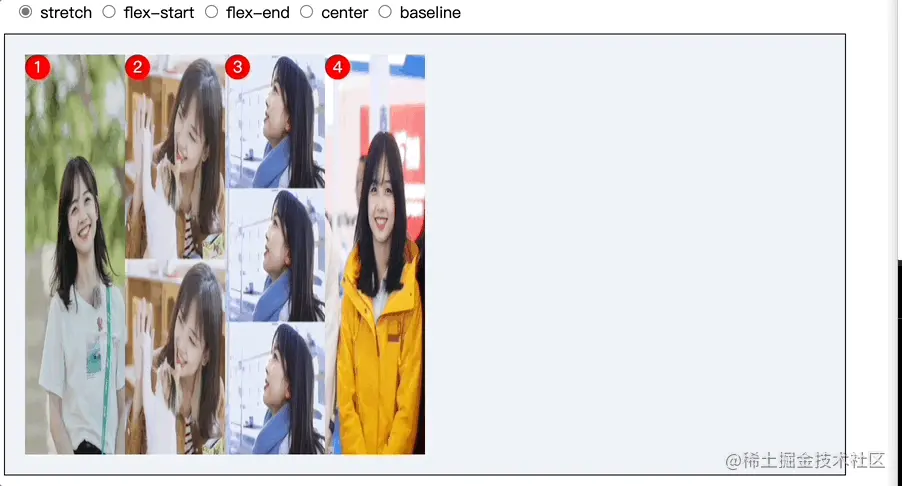 stretch(默认值):flex子项拉伸。在演示中我们可以看到冰冰图片高度是撑满flex容器高度的,就是因为flex子项的高度拉伸到容器高度导致。如果flex子项设置了高度,则按照设置的高度值渲染,而非拉伸; -