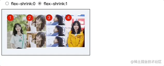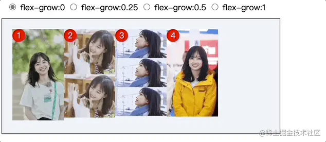 flex容器宽度为500px,四张冰冰图片的总宽为400px,每张图片宽度为100px,即flex容器剩余空间还有100px;当给编号为3的冰冰设置flex-grow属性值分别为0、0.25、0.5、1时,编号3的冰冰宽度变化为100、100+0.25*100 、100+0.5*100、100+100*1。