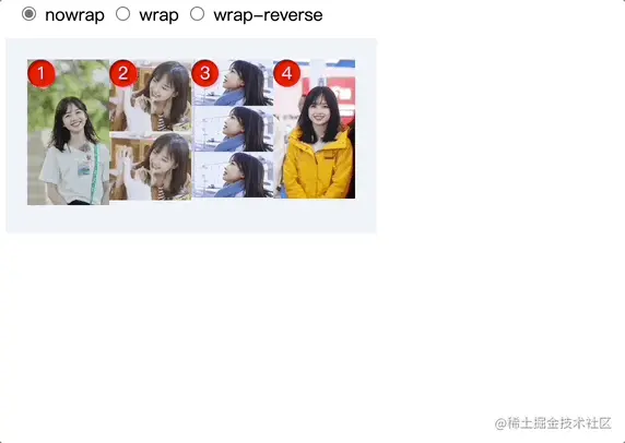 wrap: 换行,第一行在上方; -