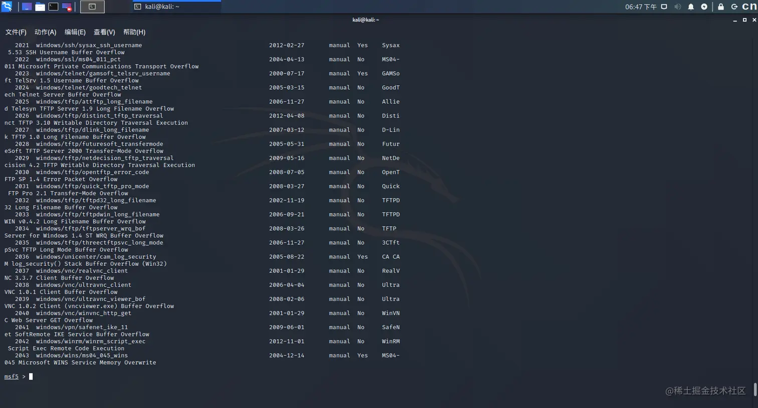 使用命令show exploits:列出metasploit框架中的所有EXP: