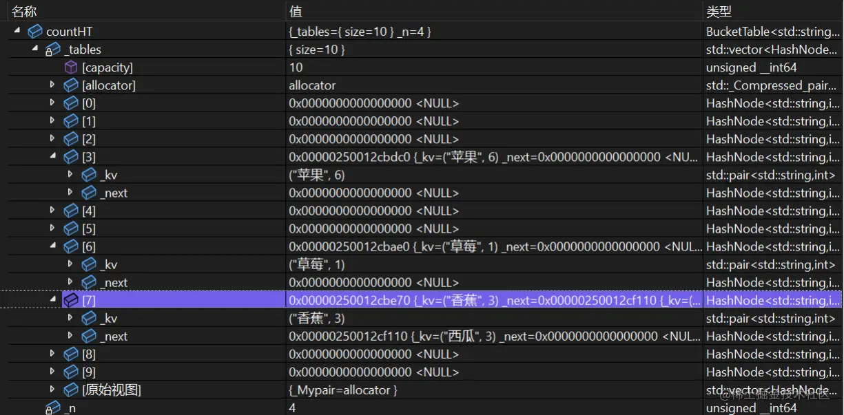 有了这个游戏之后就可以对insert函数进行改进,但是这里先不要急还有一个地方需要我们改进的就是插入数据的时候,上面扩容在插入数据的时候是创建一个哈希桶然后再调用哈希桶来插入原来哈希桶的每个数据,如果这么做的话,在新的哈希桶里面又会不断地创建地节点,并且在函数结束地时候又会删除节点,如果节点的个数非常多的话这就会导致效率低下,所以我们这里就有一个改进思路就是能不能用已有的节点来插入到新创建的哈希表呢?答案是可以的,我们依然是创建一个新的哈希表然后改变其内部的大小,然后遍历之前的老哈希表找到里面的元素并计算他在新表上的位置,然后修改其节点内部指针的指向,那么这里的代码如下: