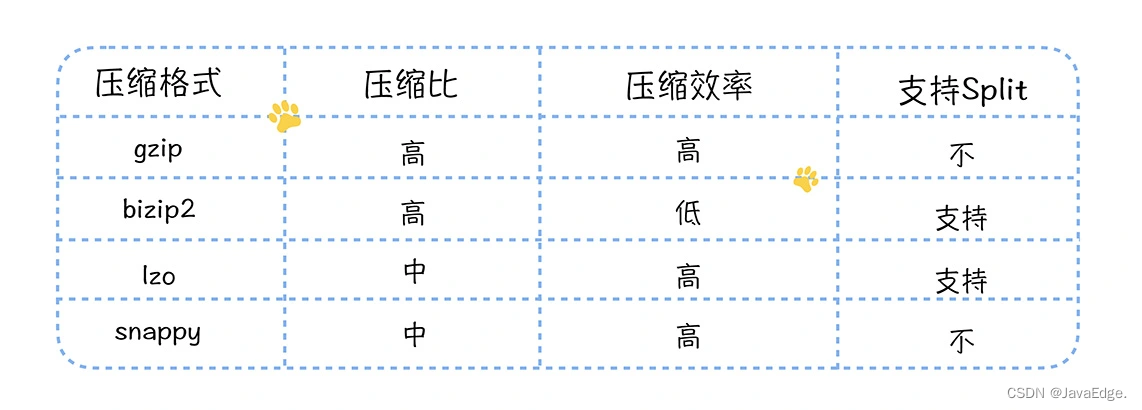 - 大文件,推荐lzo,支持split,在保证压缩效率前提下,有相对稳定压缩比