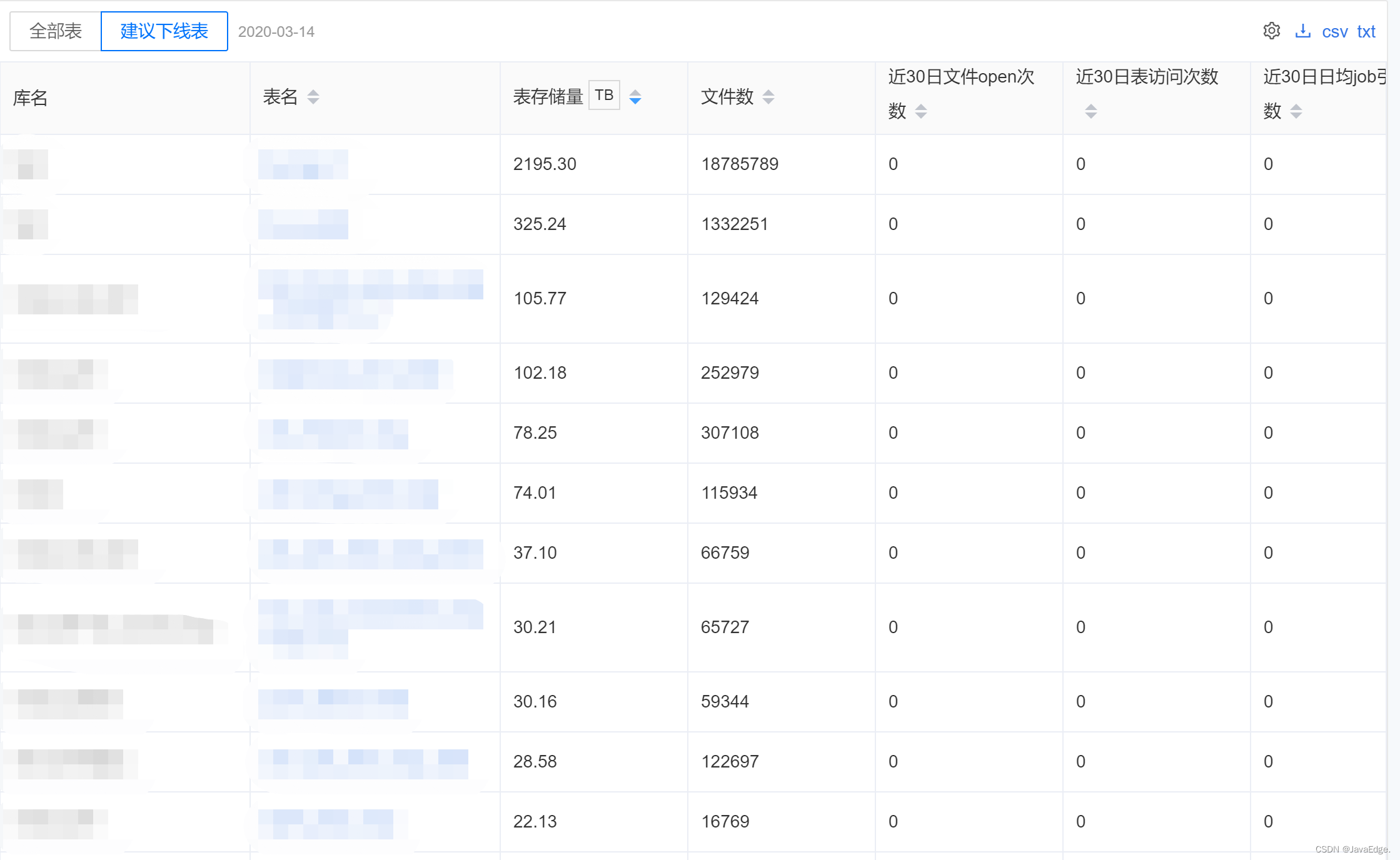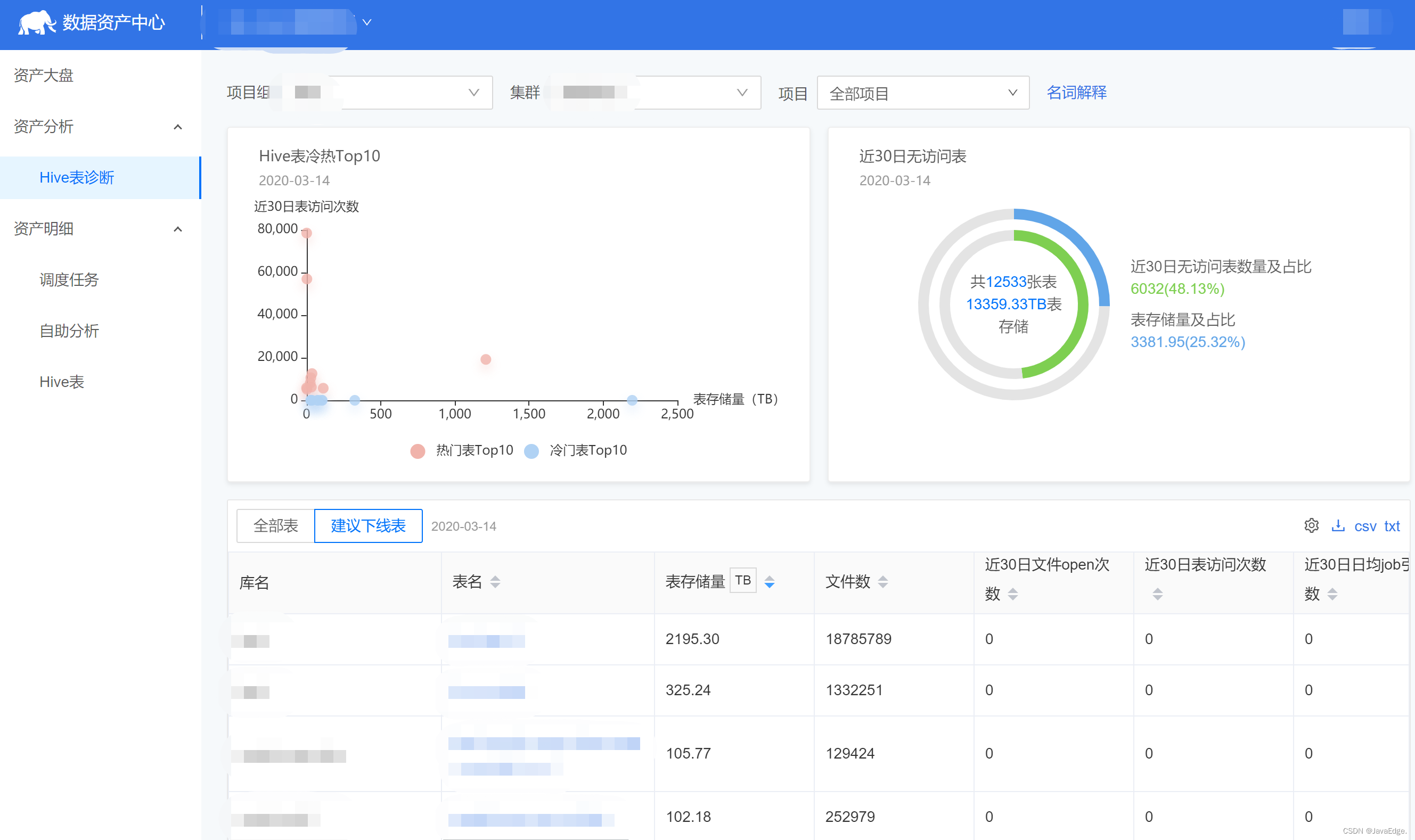 某数据中台项目,表相关的使用统计。一半的表30d内都没有访问,而这些表占26%存储。如把这些表的产出任务单独拎出,高峰期需消耗5000Core CPU计算资源,换算成服务器需125台(按一台服务器可分配CPU 40Core计算),成本一年近500W。自己竟然有这么多无用数据?我经常把数据比作手机中的图片,我们不断拍照生图,却懒得清,最终手机存储经常不够。