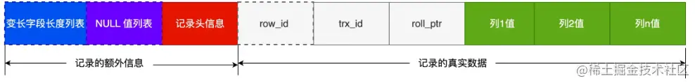 - roll_pointer 这条记录上一个版本的指针。roll_pointer 是必需的,占用 7 个字节。如果你熟悉 MVCC 机制,你应该就清楚 trx_id 和 roll_pointer 的作用了