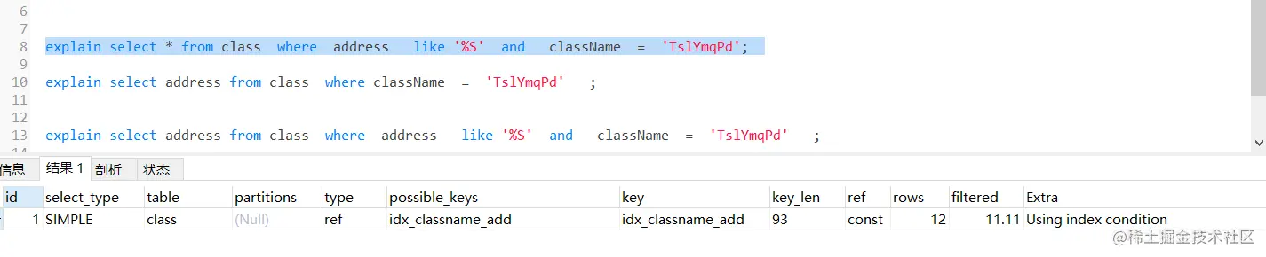 通过执行计划,我们可以看到,这里使用了联合索引,但是其实只有 className 起作用,key_len = 30*3 +1+2;其实这里看where后面的查询条件,是不满足联合索引最左匹配原则的,但是优化器会优化顺序,优化为 className = “xxx” and address like '%s' ,这样就解释了为什么用到了联合索引中的className字段;又因为like 的 ‘%S’ 会导致索引失效,所以无法使用address字段,**但是索引下推还是会帮忙在引擎层过滤数据,**最后通过server回表查询 所需要的字段。