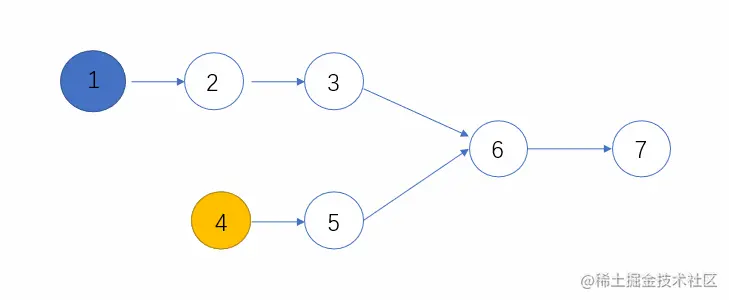 例如,输入{1,2,3},{4,5},{6,7}时,两个无环的单向链表的结构如下图所示: