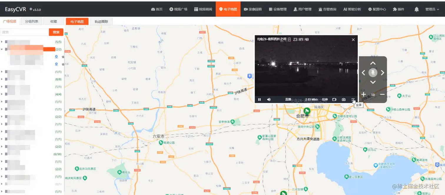 在视频监控管理平台TSINGSEE青犀视频EasyCVR的电子地图模块中,当一个设备下有多个通道时,点击该设备,然后电子地图上会出现对应通道在地图中的坐标,点击其中一个坐标进行播放,再次点击播放器的全屏按钮,会出现播放错乱的现象,如下图所示: