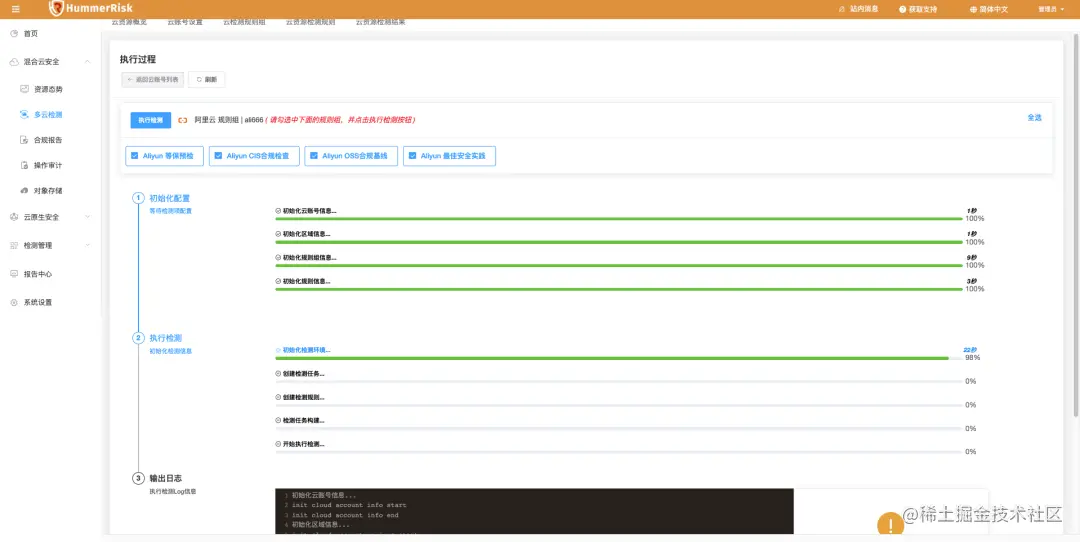 原先的多云检测在开始执行时,如果检测内容较多,会存在一些卡顿的问题。我们重构了多云检测的执行内容,现在以更加友好的效果来展现执行检测前的准备过程,也不会让人觉得系统卡住了。现在执行页面如下图:
