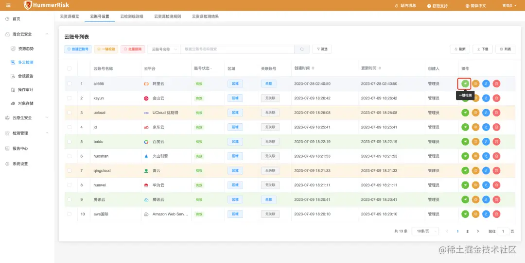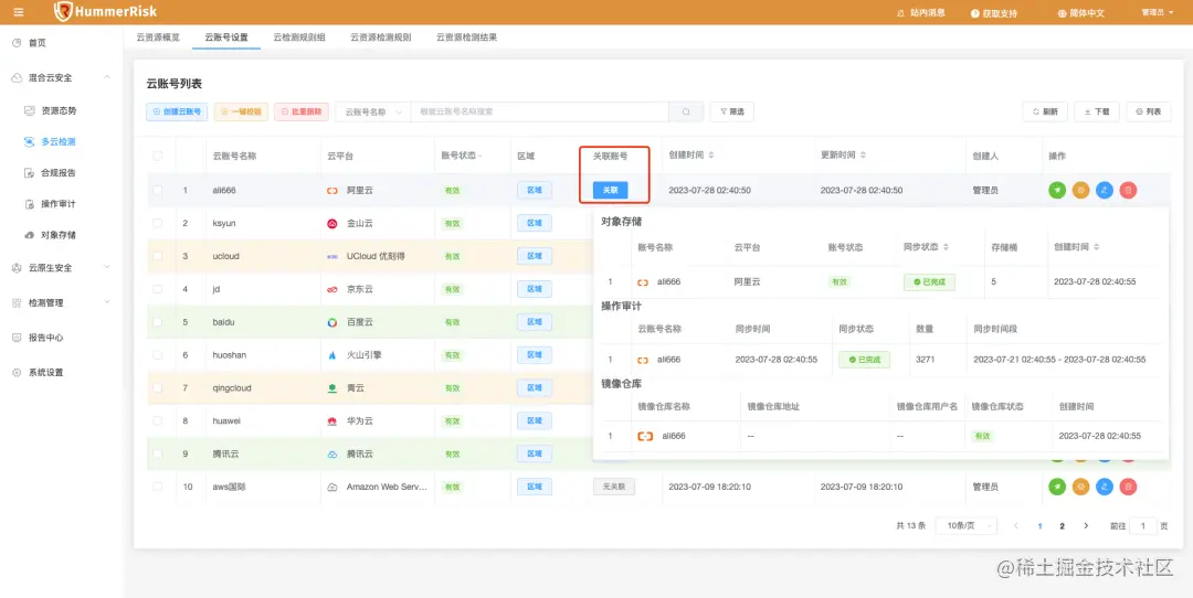 大家好,HummerRisk 1.3.0和大家见面了,在这个版本中我们继续在多云接入管理、多云检测方式、云资源态势方面提供新的能力,并增加了新的镜像仓库支持类型,并优化了云的区域选择、优化规则组内容等。同时还有很多的优化和bug修复。