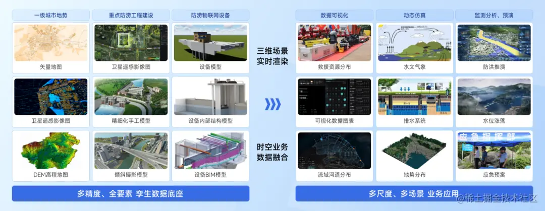 数字孪生可视化作为新型技术手段在防汛减灾中发挥着重要作用。数字孪生可视化实现城市、流域的实景三维建模,将物理世界中的事物通过数据映射,实现物理世界与虚拟世界的融合,提供虚拟现实场景和运行环境。对城市、流域进行多精度、全要素、全流程、全周期的数字孪生可视化展示,应用于多尺度、多场景的防汛业务应用,如防汛应急管理、城市内涝治理等。