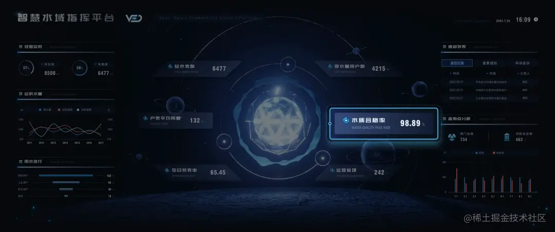 EasyV数字孪生可视化防汛应急解决方案首先支持终端监测水体的各项指标,如溶解氧、PH值、浊度等,将数据传输到后台服务器上。直接生成水域“一张图”,图中标注管理点数量、及水质合格率,水质管控者可以随时了解水质状况,预警可能出现的水质问题,并及时采取措施加以解决。这相比过去人工抽检和实验室分析的水质监测方法,节省了成本,同时避免了时间上的延迟。