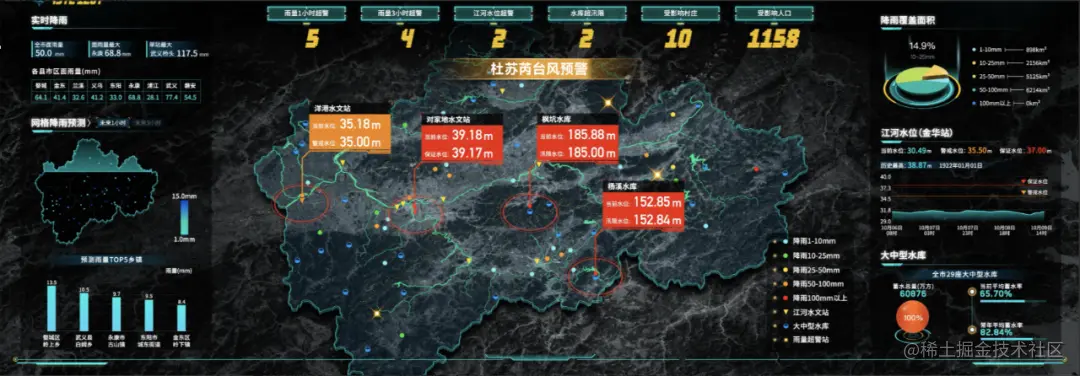 EasyV数字孪生可视化防汛应急解决方案覆盖暴雨洪涝场景,一方面监控各地区、各水库水位状况,及时感知发出预警;另一方面支持对降雨量、降雨覆盖面积、网格预测雨量、各县市区面雨量等相关雨水数据的集成展示。