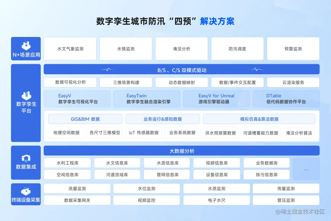 易知微基于EasyV数字孪生可视化平台、EasyTwin数字孪生融合渲染引擎、DTable低代码数据协作平台和EasyV for Unreal数字孪生游戏引擎驱动器为核心,接入GIS与BIM数据、业务运行与物联感知数据等数据,建设水文气象监测、水情监测、淹没分析、防讯调度、预警监测等应用场景。