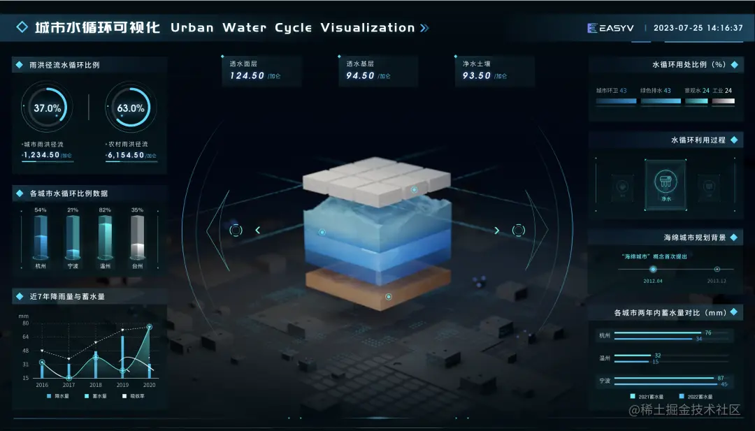 EasyV数字孪生可视化防汛应急解决方案针对城市水循环问题,从排水和蓄水两大方向出发进行规划管控,有效避免城市内涝问题。
