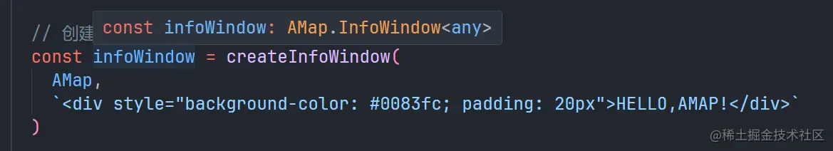 如下方法所示,该方法兼容了传入 content 和 options 两种情况,并且在调用创建信息窗体方法时,编辑器会自动对 AMap.InfoOptions 进行类型提示,且返回的信息窗体示例也带有类型提示。
