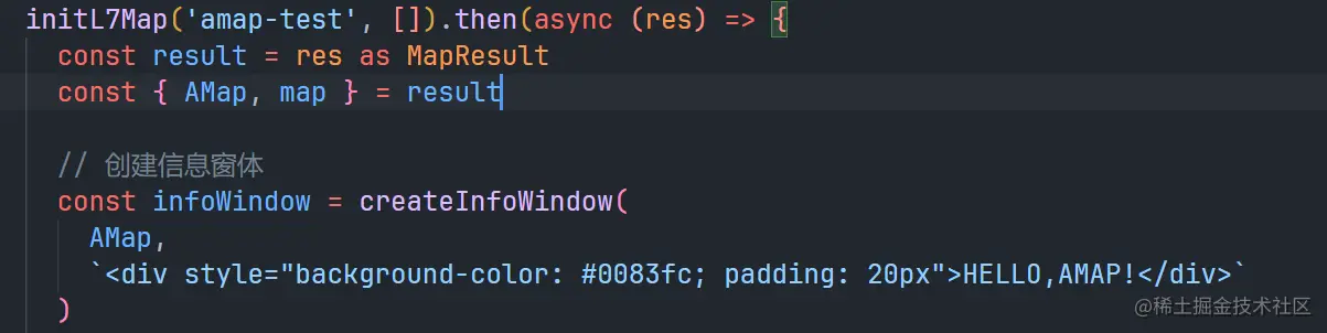 从写法上看,和 JSAPI 封装方法逻辑基本一致。且暴露 AMap 和 map 示例,对 hook 内置的方法充分利用兼容。如下图所示,创建信息窗体方法正常执行并渲染显示。