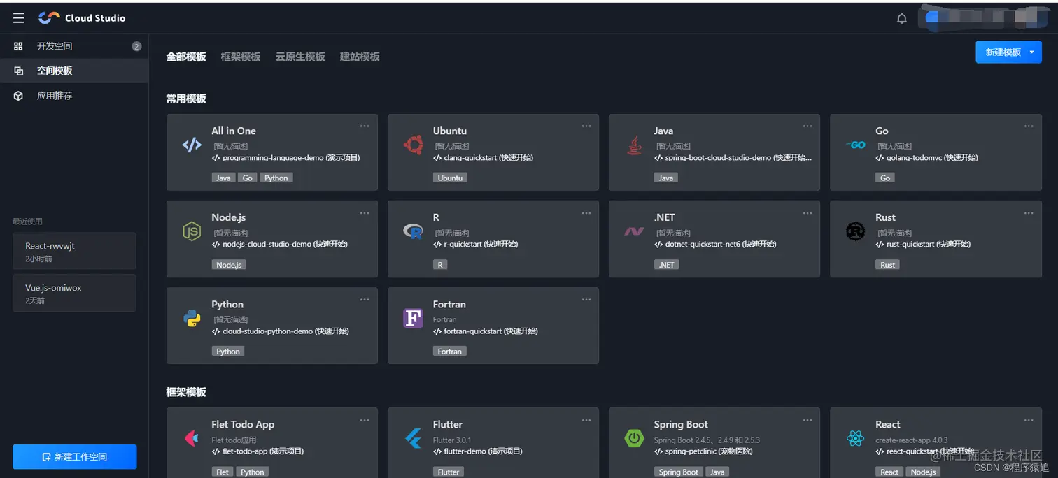 进入之后,会出现以下界面,Cloud Studio 提供了许多模版,例如框架模版、云原生模版、建站模版等,同时 Cloud Studio 也对所有新老用户每月赠送 3000 分钟的工作空间免费时长。
