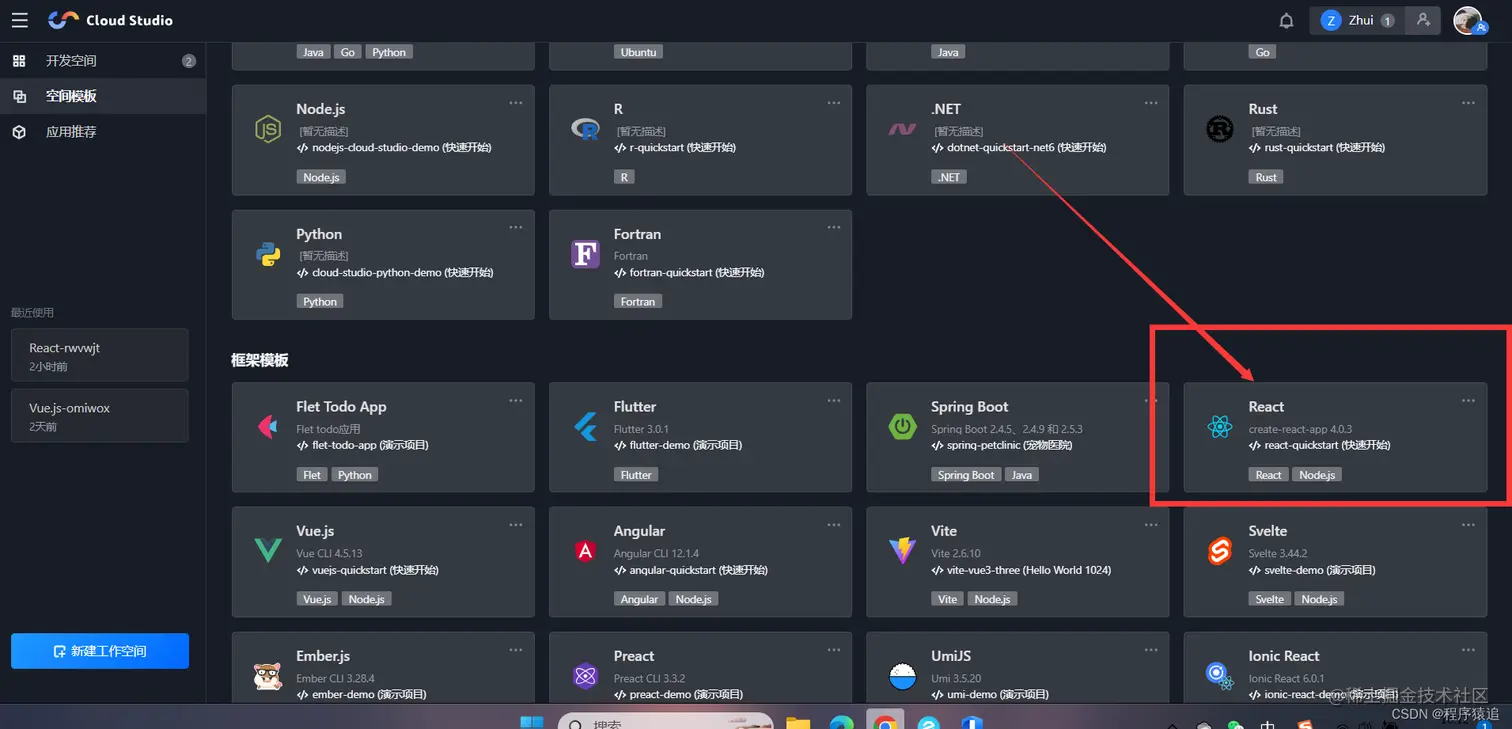 找到 React 框架模板点击进去,即可开始初始化一个 React 的工作空间,等待云 IDE 初始化完毕。