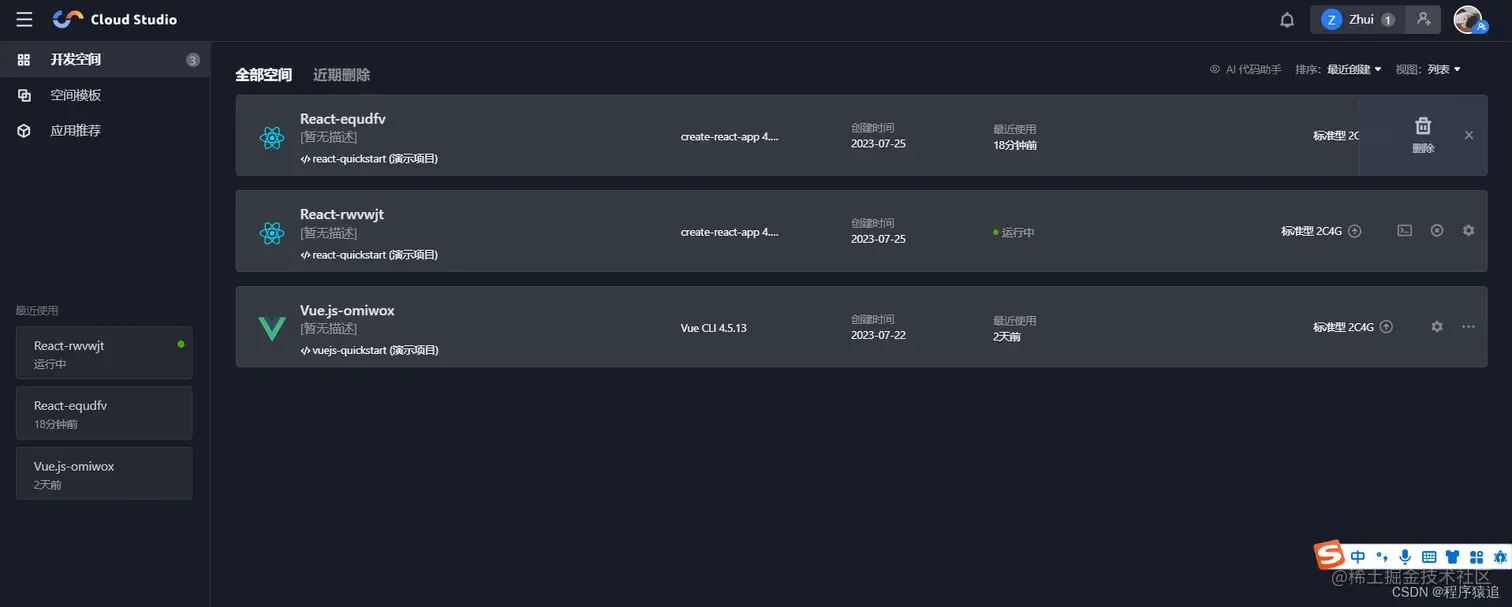 真实体验下来总结一句话——太方便了,一个基于云端的开发平台,只需要在web界面进行开发,无论是在校大学生,职场人,行业大牛等都无需在本地安装任何开发环境,并且支持多语言比如Vue, JavaScript、Python、Go、Java、C# 等;而且提供了完整的集成开发环境,包括代码编辑器、调试器、终端等功能。用户可以在一个界面中完成所有的开发工作,无需切换不同的工具。在多人协作同一项目时,Cloud Studio可以时编辑同一份代码,为团队提供了协作工具,代码审查、问题跟踪等功能。