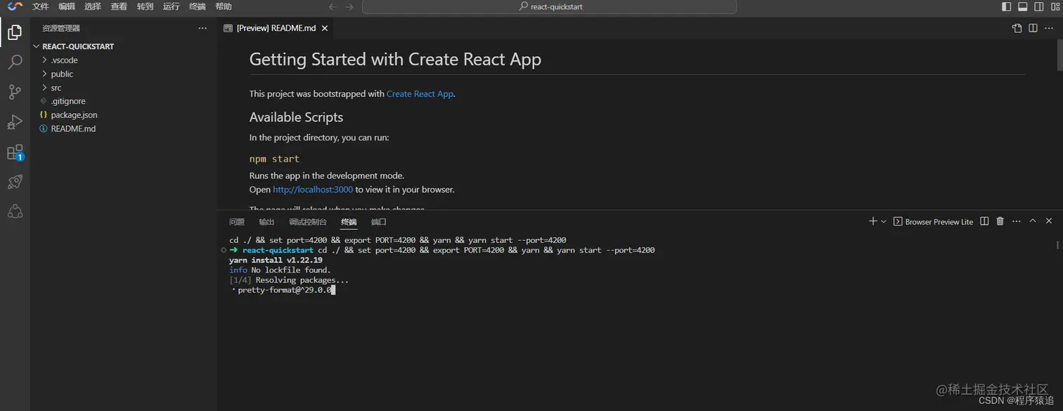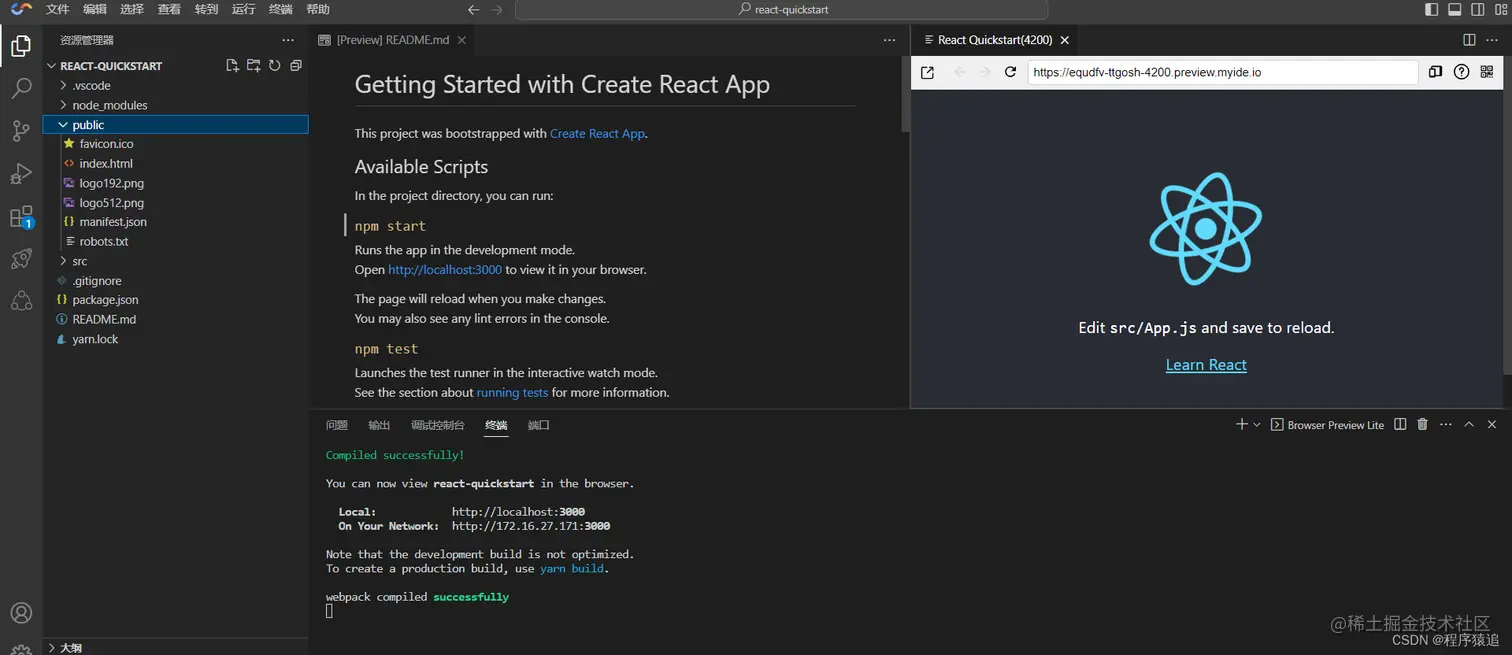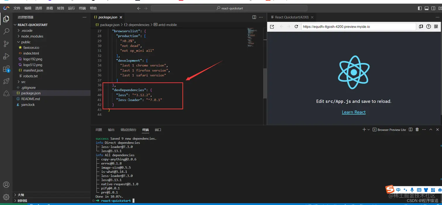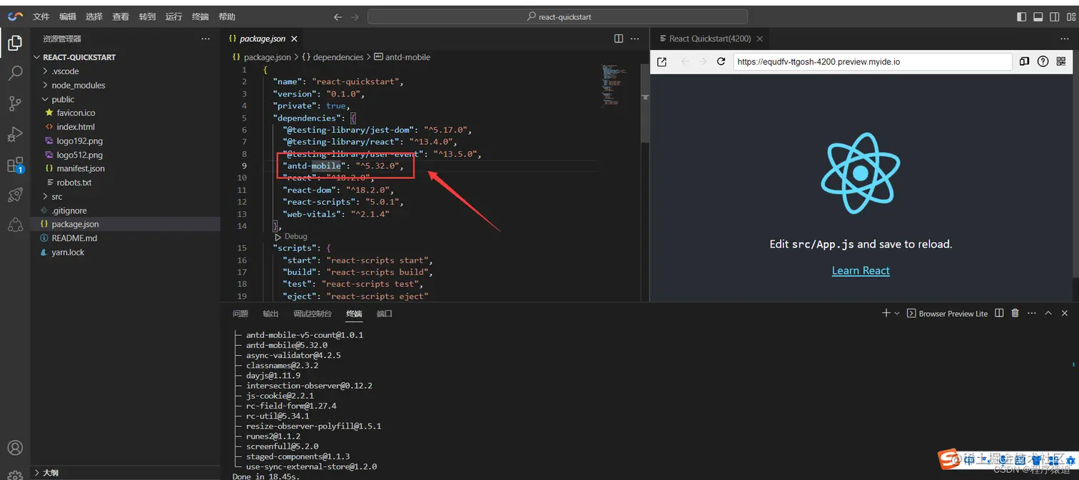 在初始化的过程中,可以看到左侧代码后,控制台会安装依赖及启动一个 React 简单的模板项目。