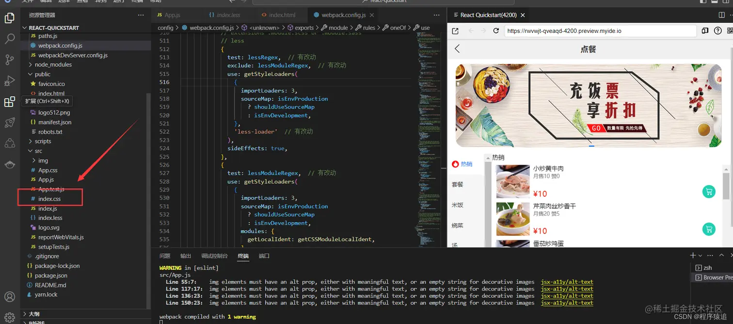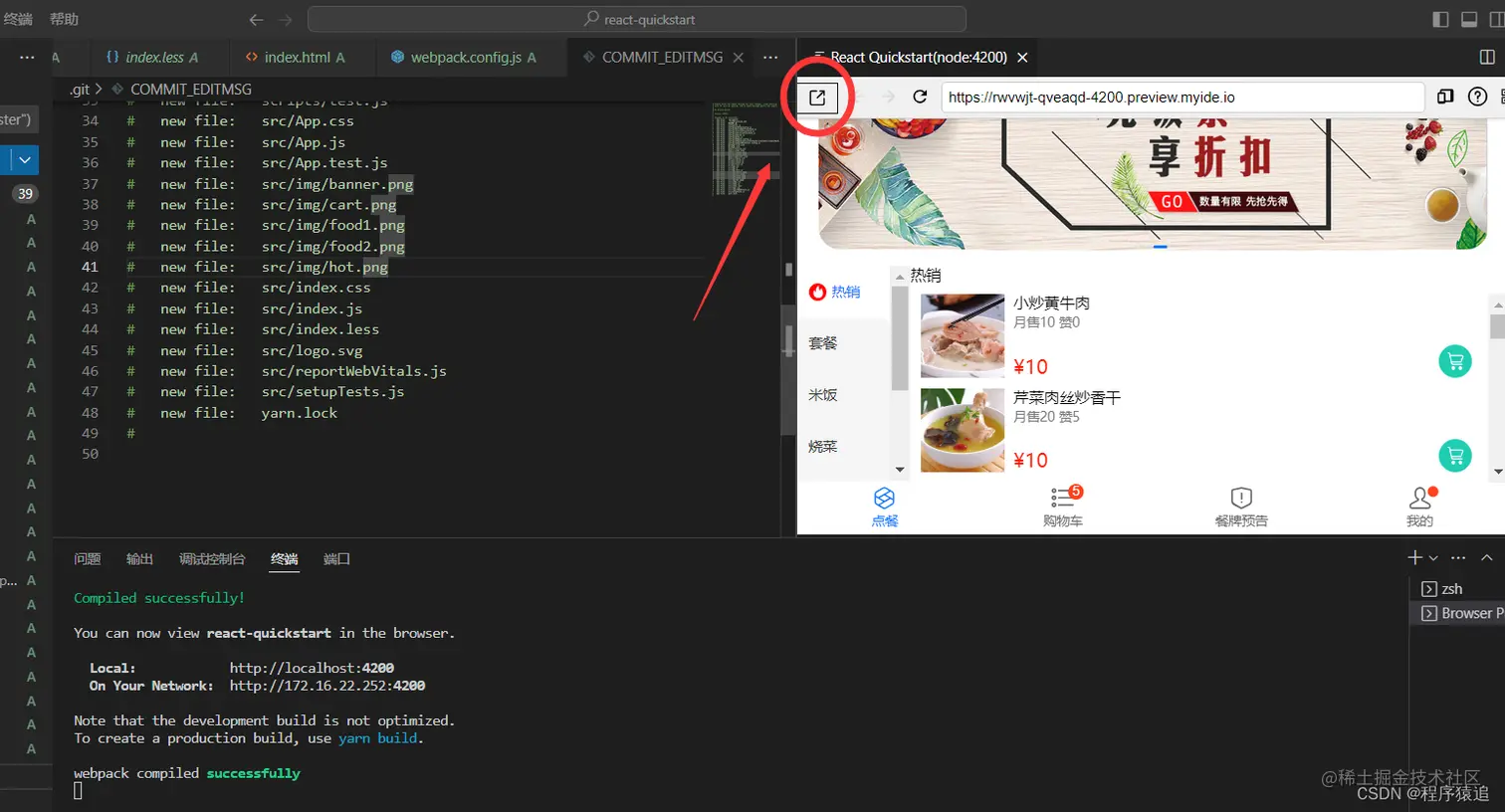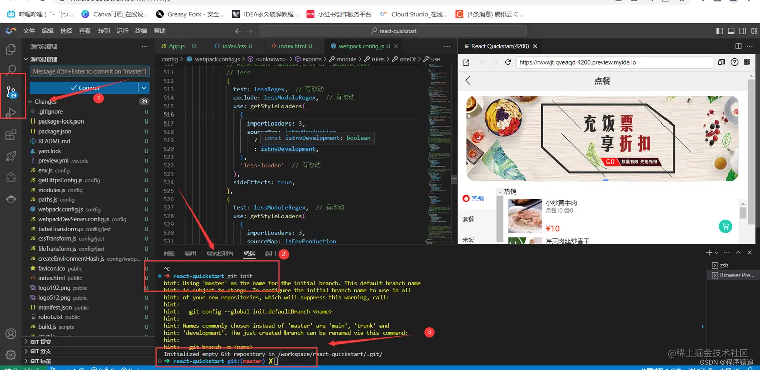 这是一个用 IDE [Cloud Studio](https://www.cloudstudio.net/?utm=csdn) 快速搭建,并开发还原一个移动端 React H5 的简版点餐系统页面,从 0 到 1 体验云 IDE 给我们带来的优势,不需要装各种环境,简单易用,开箱即可上手。