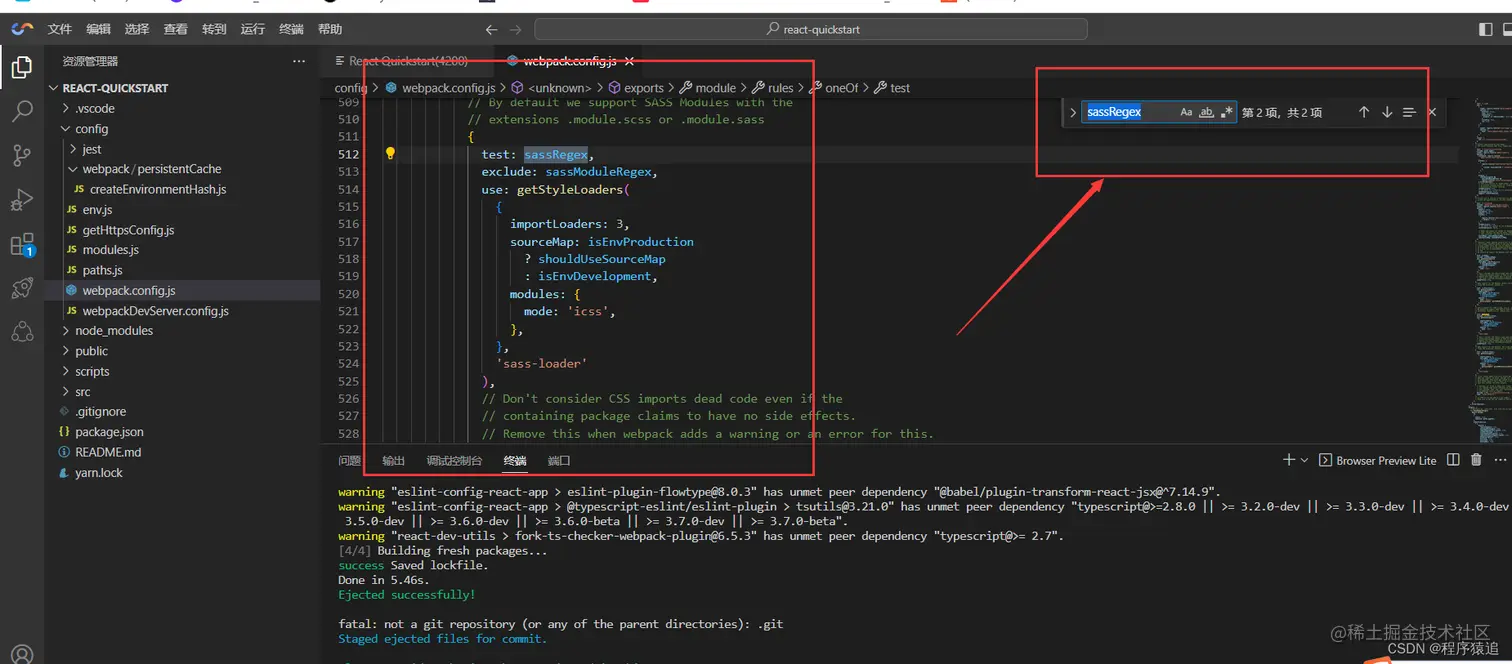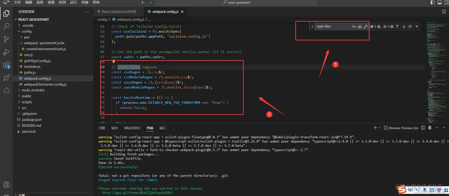 完成命令之后,项目根目录会出现一个config文件夹,找到 config/webpack.config.js 文件,按Ctrl + F 查找关键字 “style files” 。