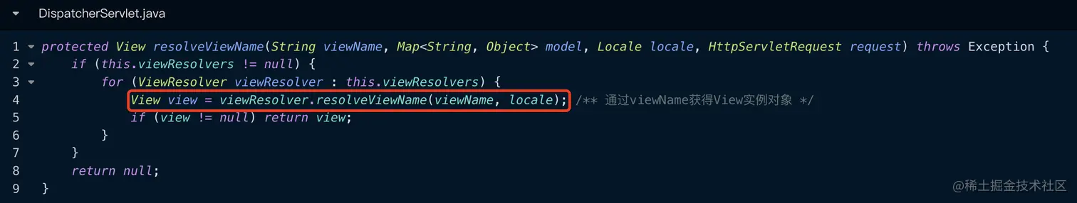 Spring通过resolveViewName(...)方法来创建view视图对象,并将其加入到IOC中,其具体实现方式还是遍历每一个视图解析器(ViewResolver),调用其resolverViewName(viewName, locale)方法,尝试获得View视图实例对象,如果获得到了,则直接返回,不需要继续遍历其他的视图解析器了,代码如下所示: