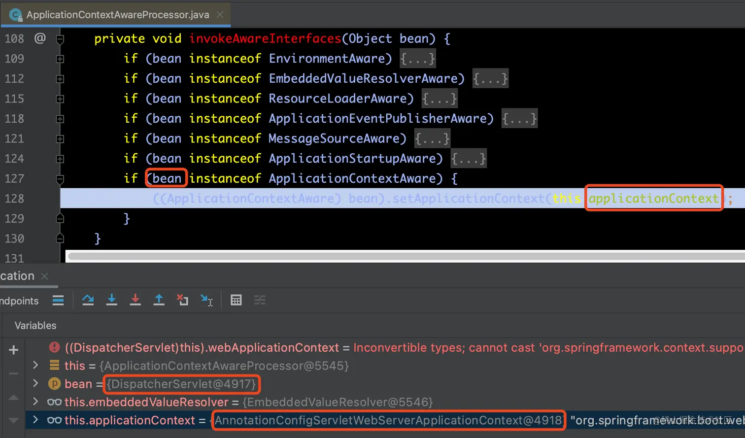 我们是通过调用Web应用上下文的isActive()方法来判断是否是活跃的,那么前提条件必然就是这个Web应用上下文是否就是null的。此处我们使用的是webApplicationContext,那么,webApplicationContext是在何时何处被赋值的呢?当Spring启动的时候,IOC会加载框架中自定义或默认注入的bean,那么当加载DispatcherServlet的时候,会执行到invokeAwareInterfaces(bean)方法中的最后一行if判断,如下所示: