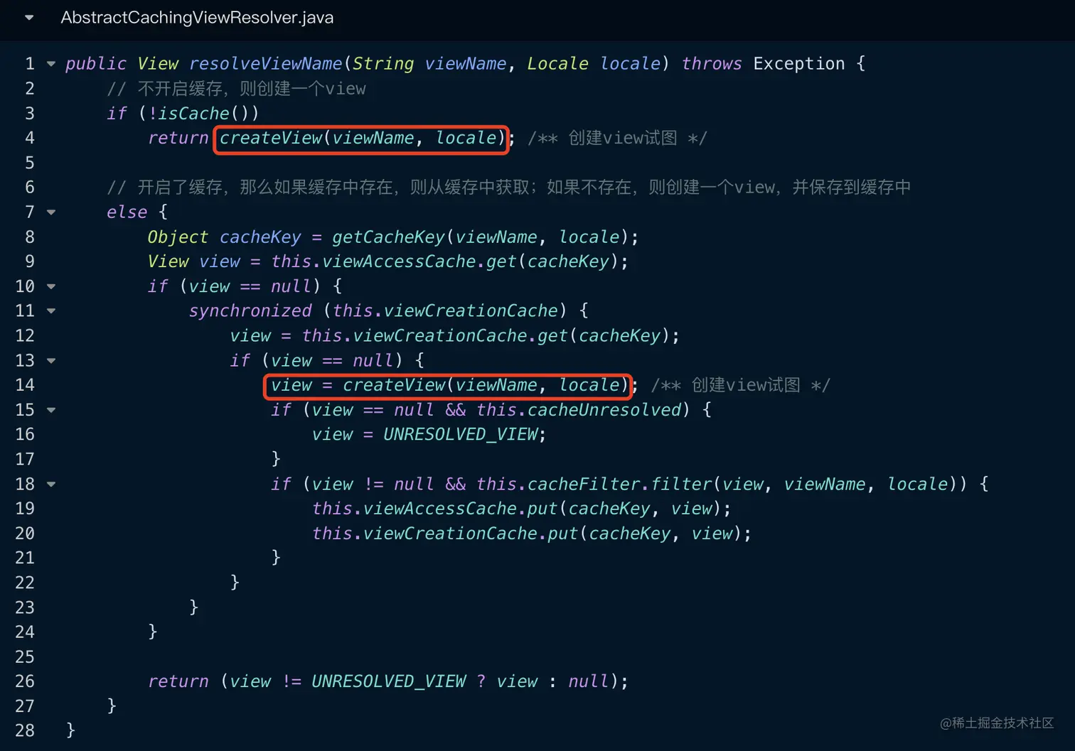 Spring通过createView(viewName, locale)方法来创建视图,在该方法中没有做什么额外的事情,只是将创建视图的工作交付给了loadView(viewName, locale)方法去做了,代码如下所示: