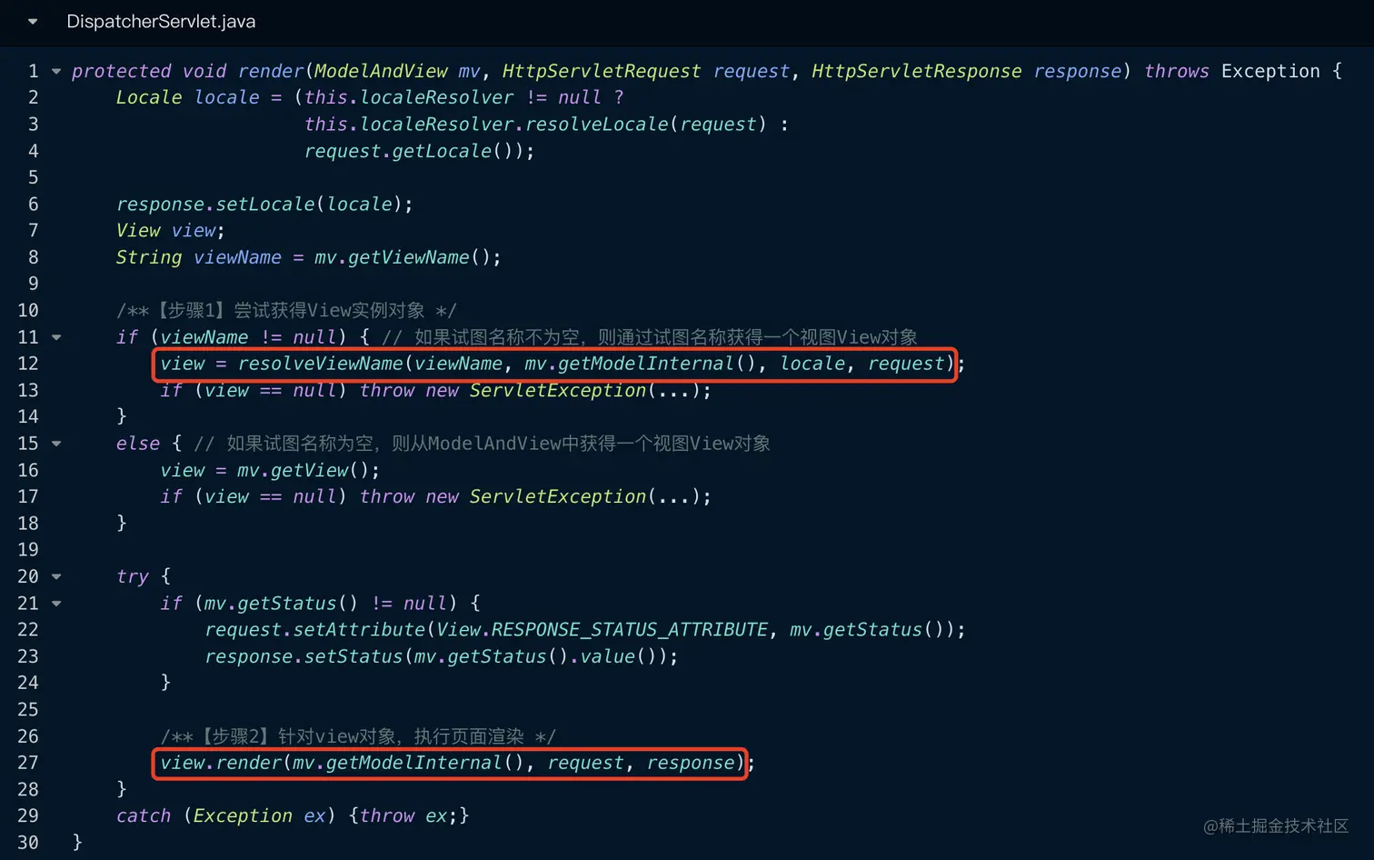当我们在第一步中获得了ModelAndView的实例对象mv之后,就可以对其进行渲染操作了,具体操作是在render(mv, request, response)这部分的代码中,在这段代码中,主要执行了两件事情,其一:尝试获得View实例对象;其二:针对view对象,执行页面渲染,代码如下所示:
