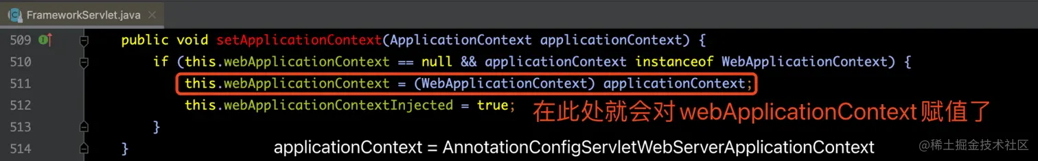 那么当进入到setApplicationContext(...)方法的时候,由于此时webApplicationContext等于null,那么就会进入到if语句内被赋值了。此时的webApplicationContext其实是AnnotationConfigServletWebServerApplicationContext类型的实例对象。代码如下所示: