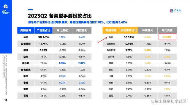 此外根据广大大数据研究院最新发布的《2023Q2全球移动游戏营销洞察》报告中的数据显示,在今年Q2休闲游戏素材量占比33.14%比去年同期提升了13.33%。究其原因就是很多中重度产品使用副玩法买量营销,在投放的同时也将自己产品和素材的属性改为休闲类。